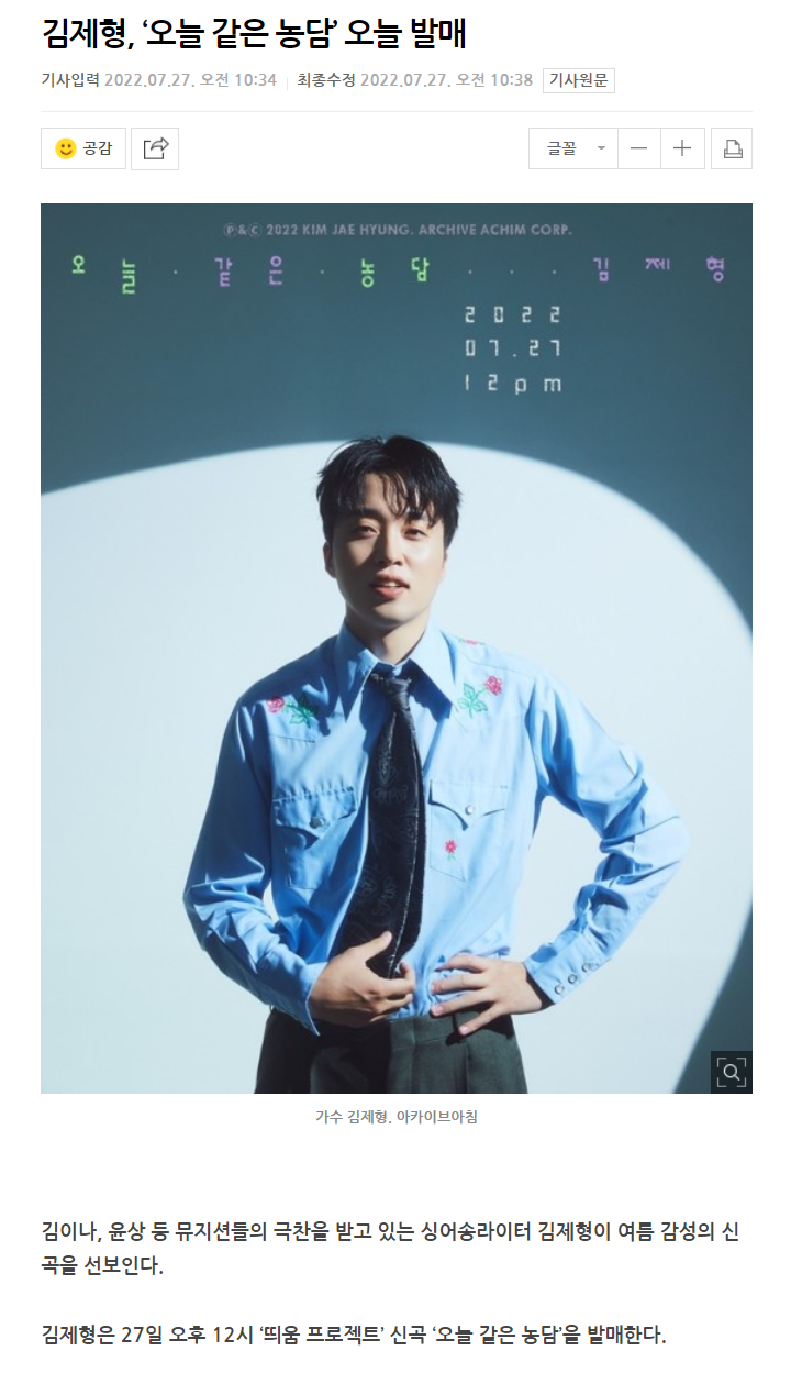 [기사] 김제형, ‘오늘 같은 농담’ 오늘 발매